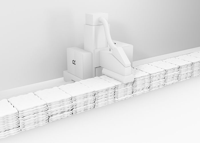 Die gereinigte und getrocknete Rohware (z.B. Baumwollfasern) wird in diesem Prozessschritt von der Maschine aufgenommen und der ersten Verarbeitung zugeführt.