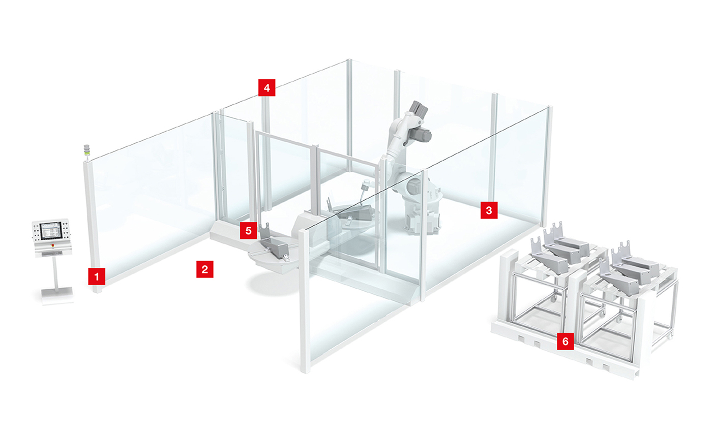Access to the dangerous area of the robot cell is to be guarded. To enable simple entry and exit of material, optoelectronic safety sensors are to be used. The compact layout of the cell means that the necessary distance between protective device and danger zone must be as small as possible.