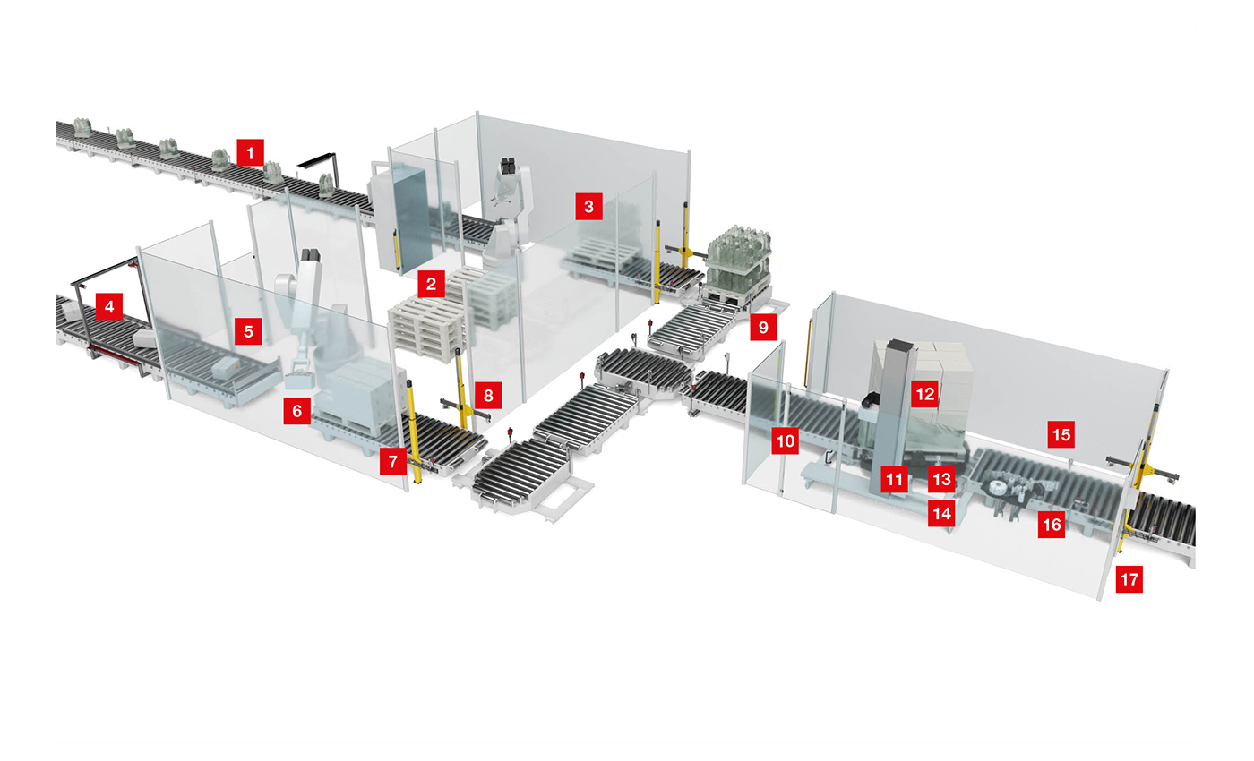 Au cours de la dernière étape d'emballage, les cartons et packs sont empilés sur des palettes et transférés à la logistique de stockage et de transport. Les exigences dans le domaine de la fin de ligne requièrent un flux matériel efficace et fiable ainsi qu'une sécurité sans faille des machines.