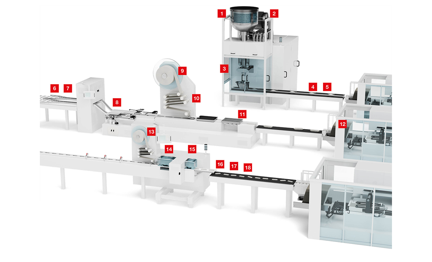 In una macchina per il packaging orizzontale, le barrette di cioccolato vengono confezionate in un film. Spesso il film di imballaggio ha una stampa a colori e non è trasparente. Per consentire la saldatura del film tubolare nel punto corretto, il bordo anteriore della barretta situata nel film tubolare deve essere rilevato in modo affidabile.